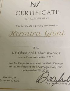 Nju Jork, 17 Nëntor/AE/ Koncert maestër Hermira Gjoni, me një karrierë brilante në piano si në Shqipëri ashtu dhe në SHBA, është nderuar me çmimin, “NY Clasical Debut Awards International 2025″, në “NY Classical Debut Awards Gala Concert”, organizuar me 15 nëntor në sallën e Recitaleve Weill në Carnegie Hall në Manhattan, në Nju Jork City(SHBA).